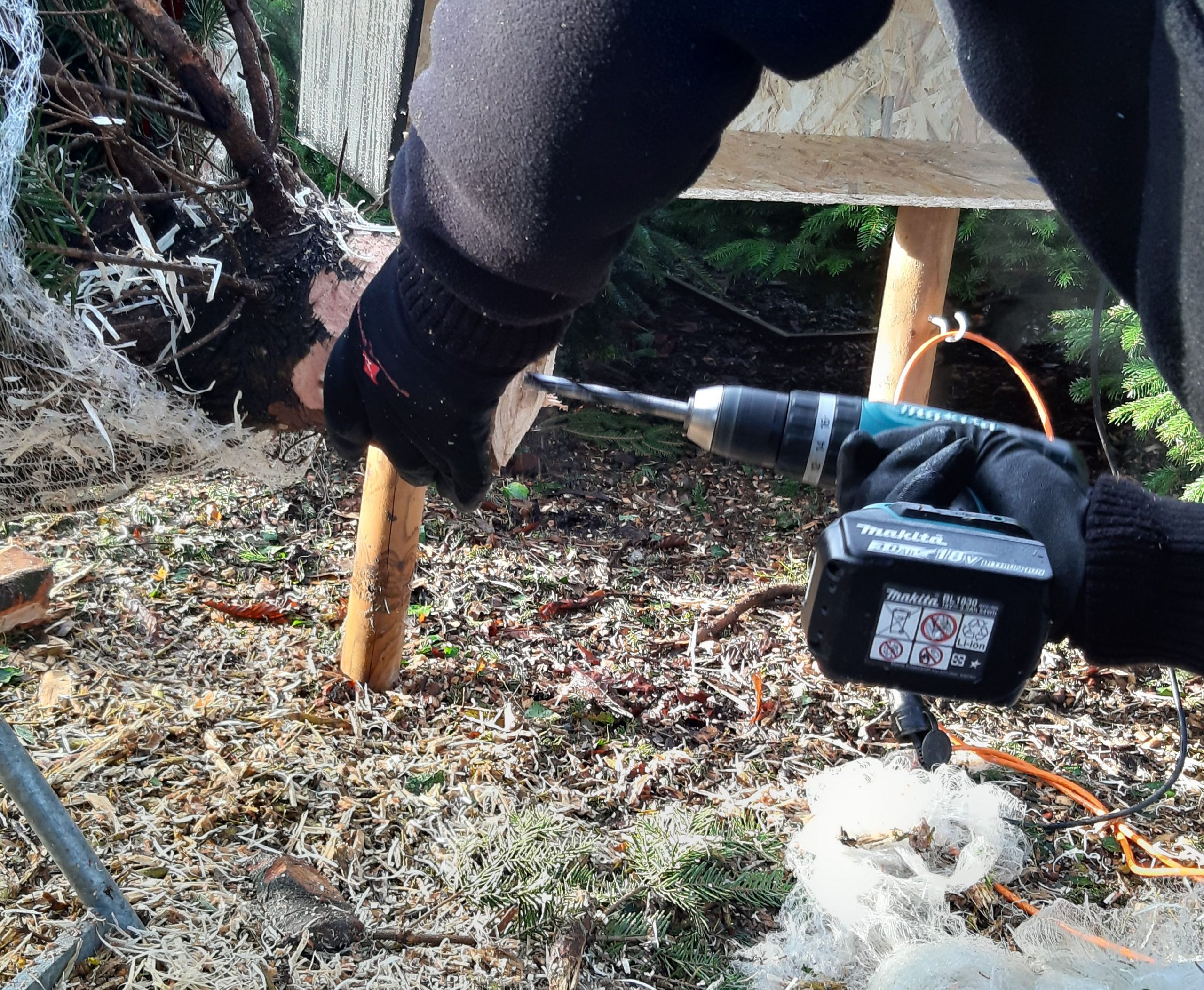 Falls Sie Ihren Baum nicht sofort aufstellen, sollten Sie ihn am besten draußen auf Terrasse oder auf dem Balkon in einen Eimer Wasser stellen und ihn aus dem Transportnetz befreien. Auch ein dunkler und kühler Ort eignet sich als Lager.